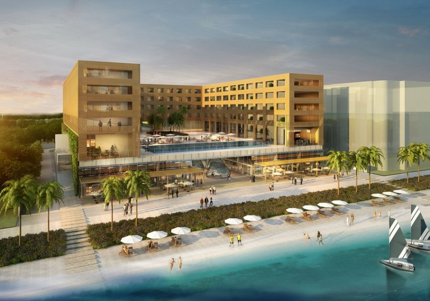 On either side of the project are strict hospitality projects following a stereotypical design: maximize the built volume at the sea front side of the lot, and create a "second rate" space to the back side for lower revenue rooms/keys around swimming pools and other amenities.