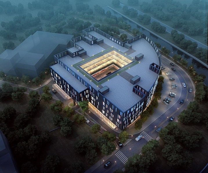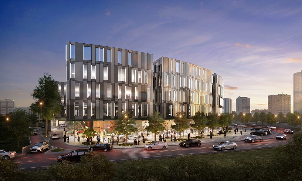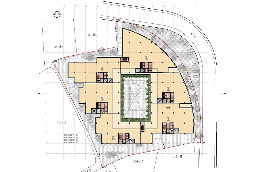 In this first option, six independent offices buildings, served by common basements for parking and services make up the project.